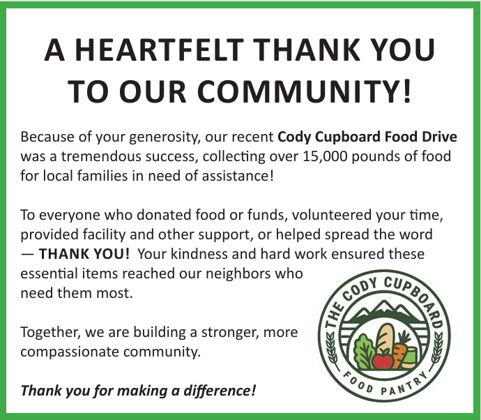 We are always accepting donations, both monetary and food. For those who want to donate food, the Cody Cupboard has two permanent food drop boxes on 15th Street behind our building. Details on how to make a monetary donation are available here.